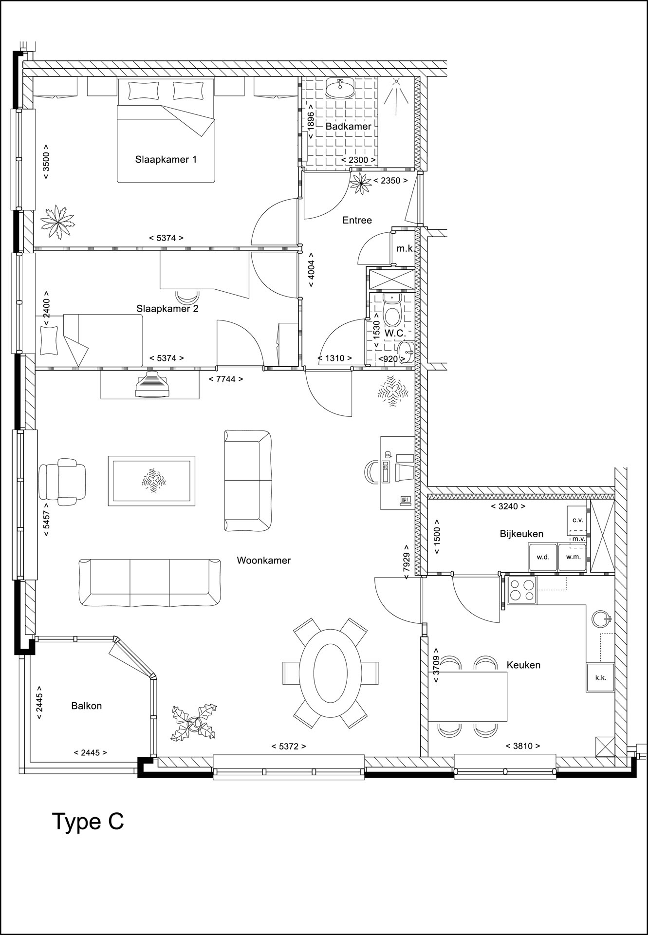 Het hoekappartement dat valt onder type C heeft een royale oppervlakte van circa 135 vierkante meter. De woning heeft een mooi uitzicht over de markt naar de Oude Kerk. De entree geeft toegang tot de twee slaapkamers en de royale woonkamer van wel 50 vierkante meter. De bijkeuken en gesloten keuken grenzen direct aan de woonkamer. De geheel gerenoveerde badkamer is voorzien van een ruime inloopdouche met een wastafelmeubel en een design radiator. Dit appartement heeft een inpandig balkon waar vanaf u het levendige centrum van Ede kunt aanschouwen.